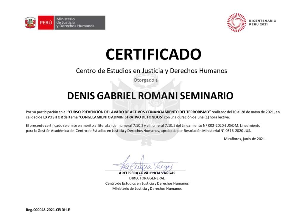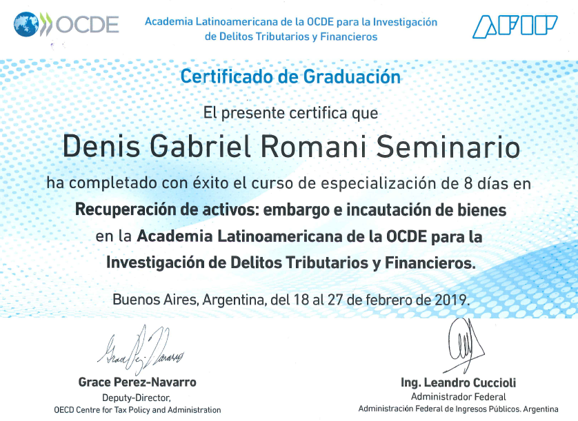 Certificado de Graduación del curso de Recuperación de activos: embargo e incautación de bienes en la Academia Latinoamericana de la OCDE para la Investigación de Delitos Tributarios y Financieros.