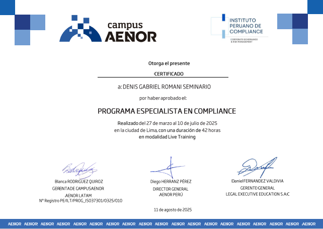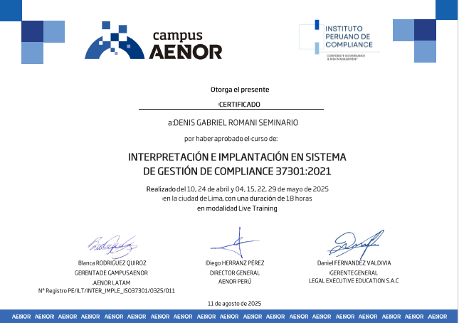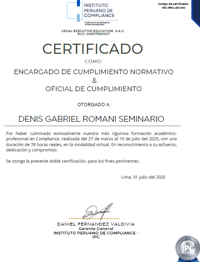 CERTIFICADO OTORGADO POR EL INSTITUTO PERUANO DE COMPLIANCE