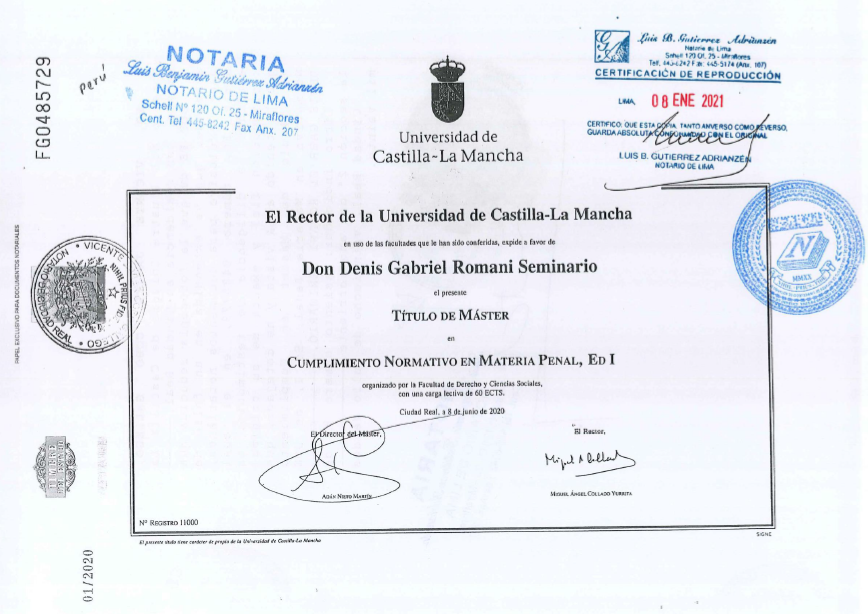 Master en Cumplimiento Normativo en Materia Penal otorgado por la Universidad Castilla – La Mancha.